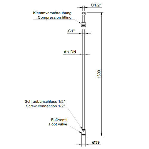 Sauglanze wahlweise d25/DN6 oder d25/DN12 aus PE elektrisch leitfähig, verstellbar mit Fussventil - für Entnahme aus IBC-Containern Durchfluss: max. 50 l/h bei Größe d25 / DN6 Durchfluss: max. 200 l/h bei Größe d25 / DN12 - ohne Niveaukontakte - Werkstoff: PE-el elektrisch leitfähig, schwarz - Baulänge 1300 mm - Anschluss mit Gewindemuffe G1/2 Innengewinde - Gewindeanschluss vertikal - Saugrohr wahlweise d25/Innen-d 6 mm oder d25/Innen-d 12 mm - Klemmverschraubung aus PE-EL, d25/G2 Zoll Außengewinde, oben am Multi Flex Block® einschraubbar Fussventil zur Richtungsbegrenzung und Ansaugung von Fluiden - Ein Zurückströmen der Flüssigkeit entgegen der Durchflussrichtung wird zuverlässig verhindert - Fussventil-Abmaße: Aussendurchmesser 39 mm x 66 mm - Eingang mit Sieb-Bohrungen d 3 mm - Kegel federbelastet, öffnet bei 0,2 bar - Werkstoff Rückschlagfeder: Hastelloy C4 - O-Ringe wahlweise EPDM, FPM oder FEP-FPM (FEP-ummantelt) - Werkstoff Fussventilgehäuse PE-el, demontierbar am Gehäuse-Anschluss: G1/2 Innengewinde - Druckstufe: SDR11 - Einbaulage senkrecht - elektrisches Potential wird abgeleitet, geeignet für Ex-Zone 1 und 2 |