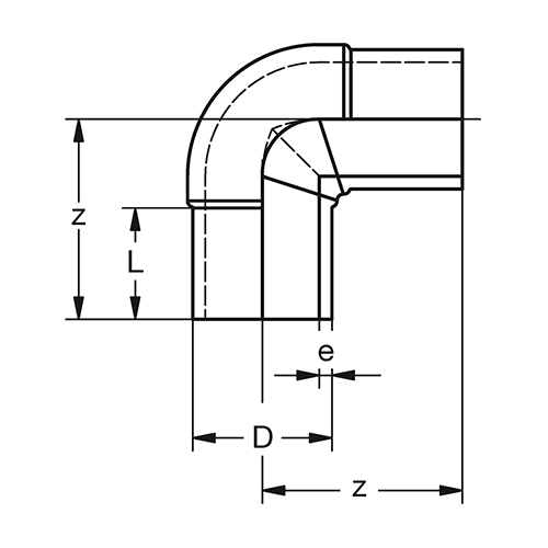 Außendurchmesser und Wanddicke entsprechend EN 1555 und EN 12201. Toleranzen bei den Z-Maßangaben sind abhängig von der Dimension. Bis d/D 160 = +/- 3 mm. Ab d/D 180 = +/- 10 mm.