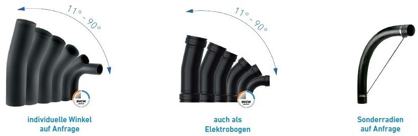 Nach jahrelanger Forschung sind wir als erster und einziger Hersteller in der Lage, normkonforme DVGW zertifizierte nahtlose Bögen mit „r ≈ 1,5 x d“ zu fertigen, die nach DIN EN 12201-3 und DIN EN 1555-3 die geforderte Mindestwandstärke einhalten und damit selbst für größte Beanspruchung optimale Voraussetzungen gewähren. Produkte mit DVGW-Kennzeichen geben die Gewissheit, dass es sich um hochwertige Produkte handelt, die in jeder Hinsicht den anerkannten Regeln und dem aktuellen Stand der Technik entsprechen.
