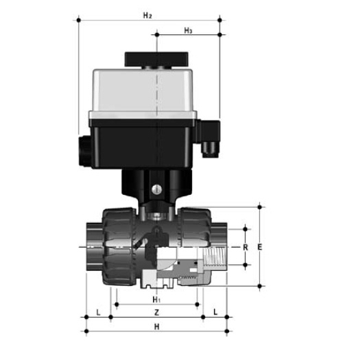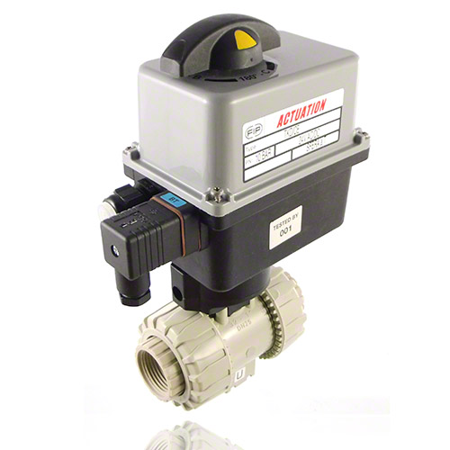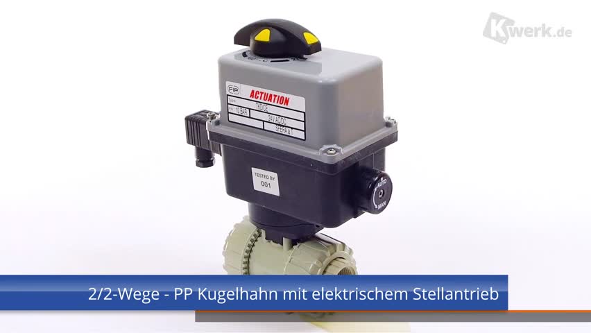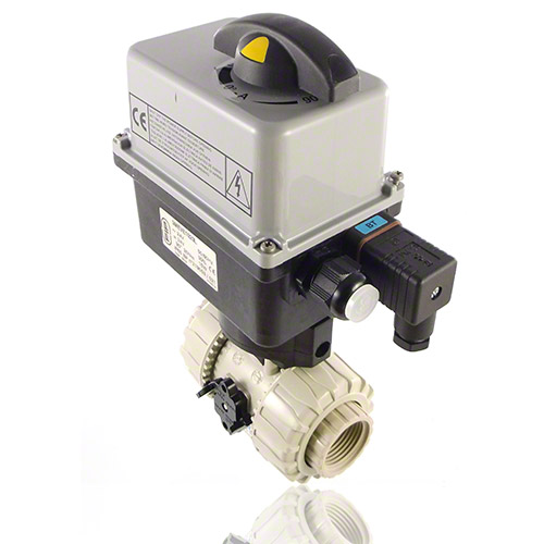 | 2/2-Wege-Kugelhahn mit gesicherten Überwurfmuttern aus PP mit elektrischem Stellantrieb mit Endlagenrückmeldern, Handnotbetätigung und optischer Stellungsanzeige Stellantriebsdaten: Standard 90-240V / 50-60Hz (AC), ohne Aufpreis 24V AC/DC Andere Spannungen auf Anfrage Anschlussart: Gewindemuffe Dichtung: PTFE/EPDM |