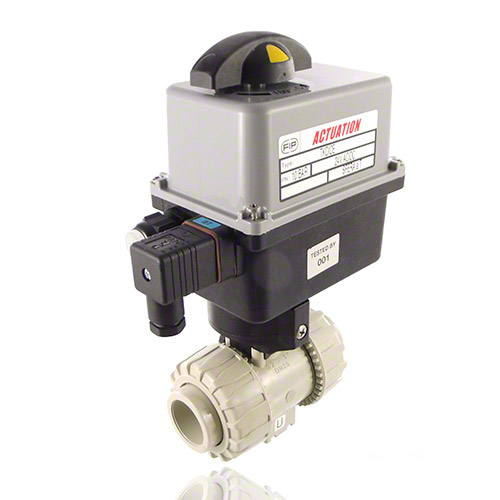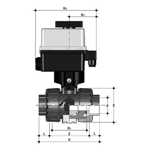 | 2/2-Wege-Kugelhahn mit gesicherten Überwurfmuttern aus PP mit elektrischem Stellantrieb mit Endlagenrückmeldern, Handnotbetätigung und optischer Stellungsanzeige Stellantriebsdaten: Standard 90-240V / 50-60Hz (AC), ohne Aufpreis 24V AC/DC Andere Spannungen auf Anfrage Anschlussart: Schweißmuffe zum Heizelementmuffenschweißen Dichtung: PTFE/FPM |