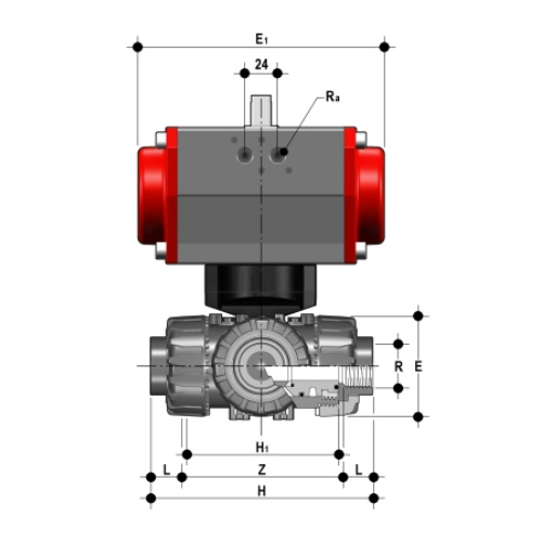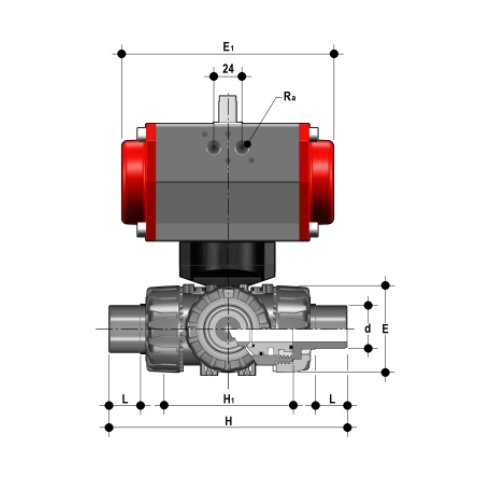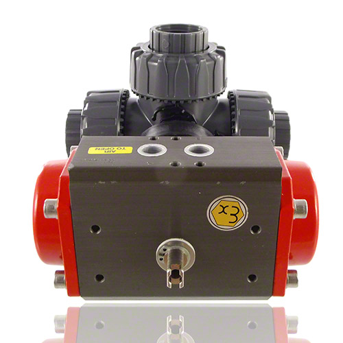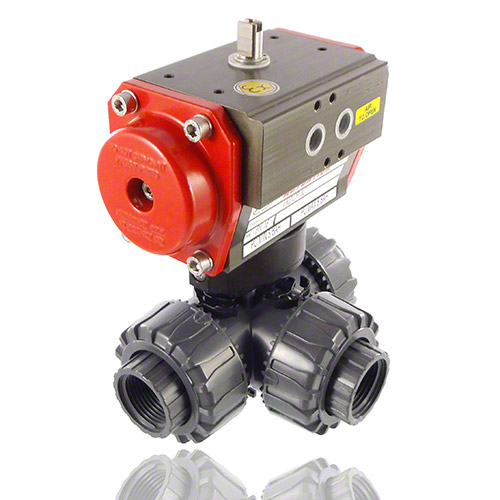 3-Wege-Kugelhahn aus PVC-U mit pneumatischem Stellantrieb