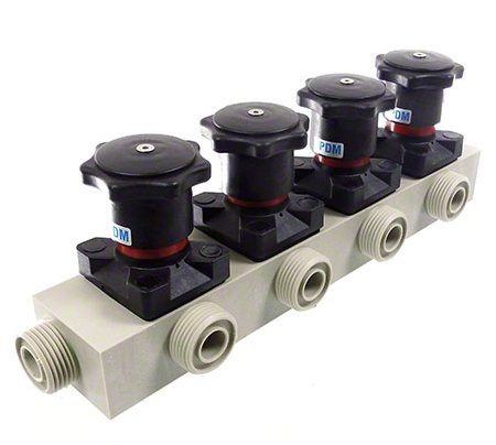 Der dargestellte „Verteiler“ ist ein Bespiel für eine Auswahl an Möglichkeiten. Die Ventile werden kundenspezifisch in PVCU, PVCC, PE, PP, PVDF und anderen Sonderwerkstoffen angefertigt.