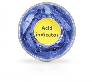 Bei Verbrauch der Granulat-Füllung, verfärbt sich der INDIKATOR  bei Einsatz von säurehaltigen Dämpfen von BLAU auf GELB und beim Einsatz von laugehaltigen Dämpfen ergibt sich ein Farbumschlag von BLAU auf WEISS.