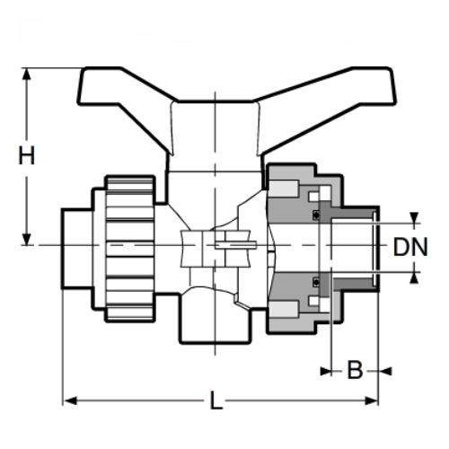 3-Wege-Kugelhahn PPGF, PP-Muffen. EPDM = roter Hebel