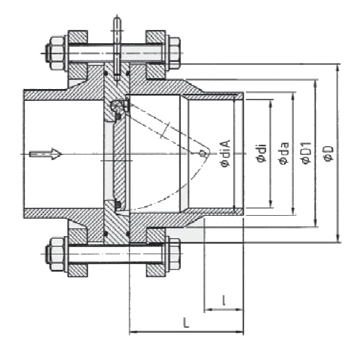 - Dichtung: FPM Einbau eingangsseitig an Bundbuchse ISO/DIN mit flacher Dichtfläche; ausgangsseitig an Austrittshilfe Beruhigungszone von mind. 5 x Nenndurchmesser (DN) vor und nach der Rückschlagklappen Keine direkte Montage auf Pumpenflansch oder nachfolgenden Bögen Für dichtschließende Rückschlagklappen ist ein Differenzdruck vom mind. 0,3 bar erforderlich, bei geringeren Differenzdrücken bitte Rücksprache halten - Max. zulässiger Betriebsüberdruck bei Wasser und 20°C von 6 bar - Öffnungsdruck vertikal in mbar - Installationsanleitung beachten - weitere Abmessungen auf Anfrage - Rückschlagklappe aus Hastelloy 2.4610 auf Anfrage |