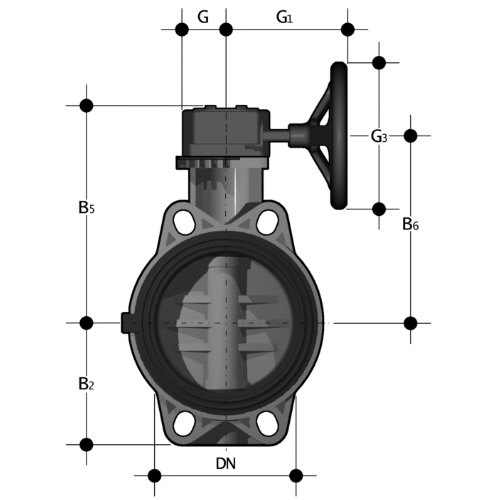 PVC-U Absperrklappe FE, Handgetriebe, EPDM -zentrisch gelagerte PVC-U Klappenscheibe -Dichtung: EPDM -Führungswelle: Stahl, verzinkt -Handgetriebe für 90° Drehbewegung -Beim Einbau ist auf eine ausreichende Freigängigkeit der Klappenscheibe achten -Rückmelder auf Getriebe nicht möglich -Mit Nachrüstsatz "End-Kit" als End-Absperr-Armatur einsetzbar (DN65-200) -Für Anwendungen in PVC-U-Rohrsystemen (Einsatz von Bundbuchsen) in d125 und d200 sind Absperrklappen DN100 und DN200 zu verwenden. Hierzu sind spezielle Adapterbundbuchsen (Typ QPV-FE-FK) zu verwenden. Bei Anwendungen in ABS-Rohrsystemen halten Sie bitte Rücksprache mit unserem Produktmanagement. -Z = Zwischenbaumaß |